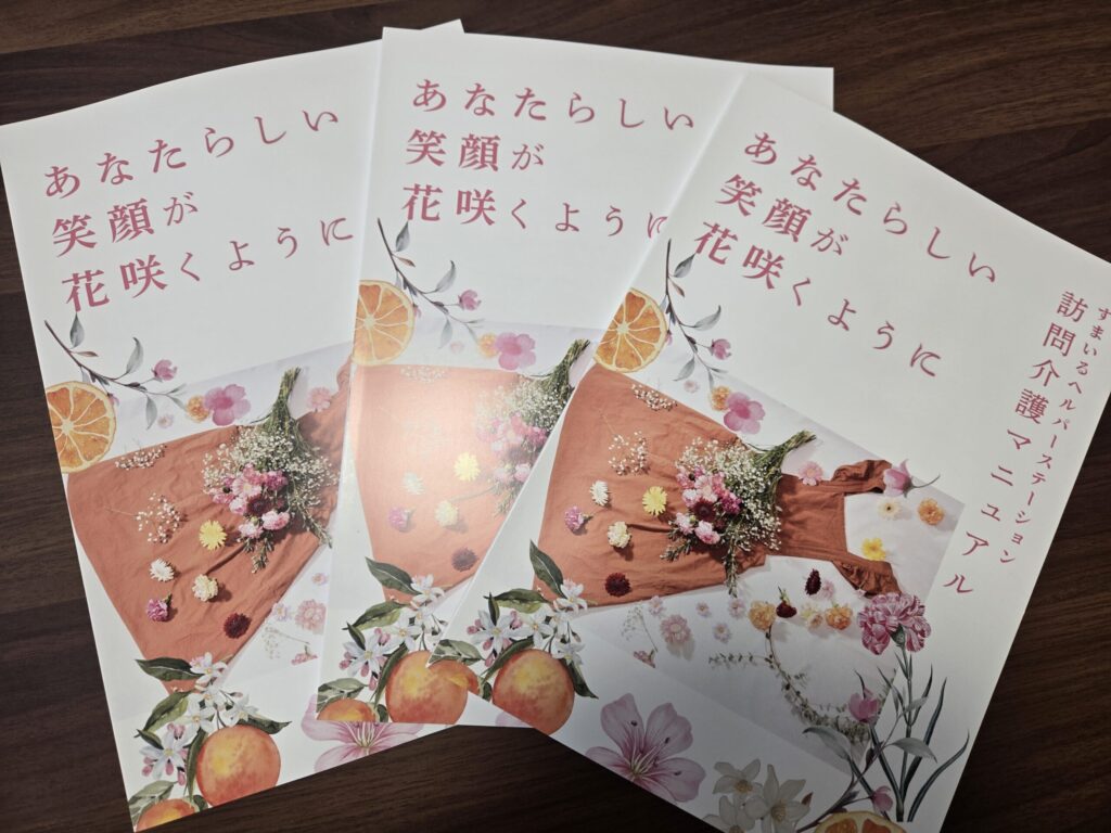 訪問介護マニュアル本 投稿日 2026-02-11 著者 helper カテゴリー ヘルパーのそっと日記 すまいるヘルパーステーションでは、事業所独自の訪問マニュアル本があります。 昨年、作成しました。中身は、訪問介護制度の仕組みから実際のケアの手順まで、この一冊を見れば全てが分かると思います! そして、表紙がとても素敵です🎶 ヘルパーには一人一冊お渡ししています。今後は事業所の研修や、新人研修でも使用していきます。
